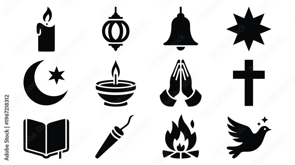 Diverse religious and spiritual symbols collection candle lantern bell star crescent moon with star diya lamp praying hands cross open book torch bonfire and dove of peace #1967218312