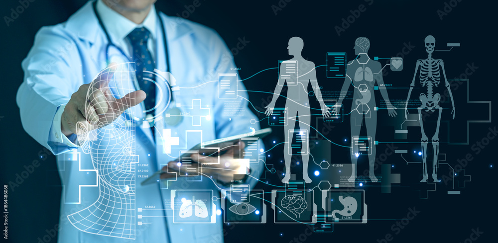 Doctor analyzing virtual human anatomy and organ scanning interface. Digital medical diagnosis, physiology x-ray visualization, and futuristic healthcare technology concept. #1864486068