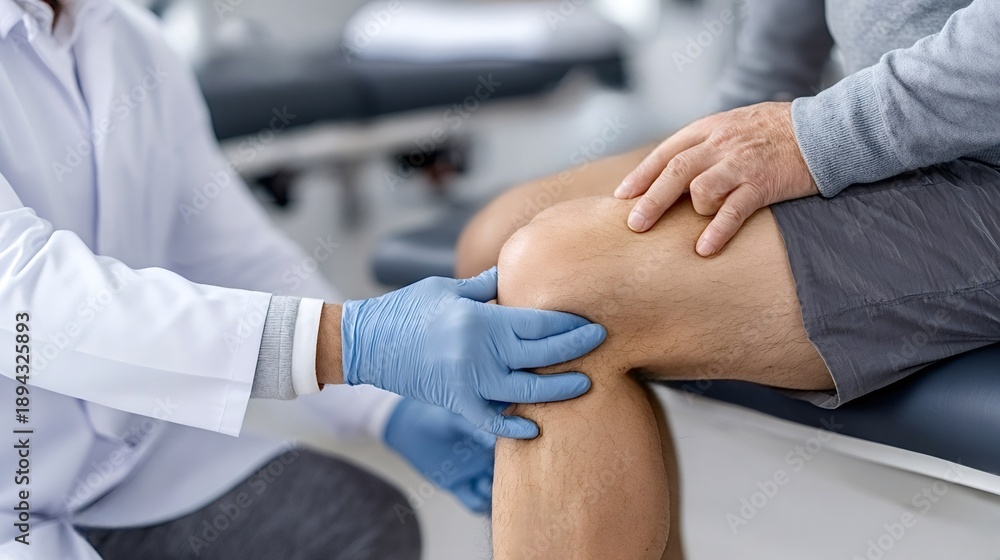 Doctor in medical gloves examining a patient's knee, providing orthopedic care and assessment for joint pain or injury recovery during a healthcare checkup #1894325893