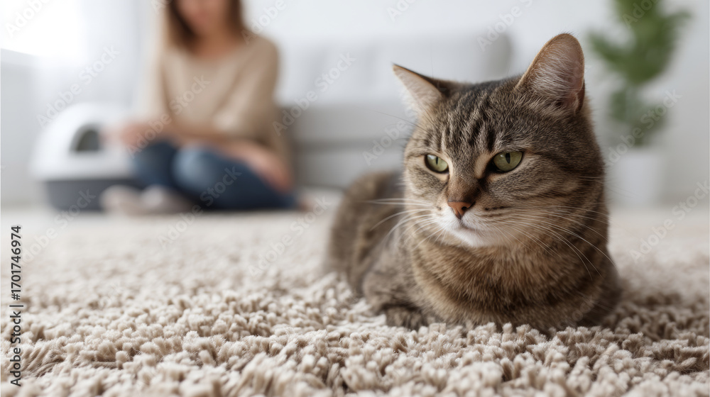 Domestic tabby cat resting on plush carpet near female cleaning litter box, highlighting pet care routine and home environment #1701746974