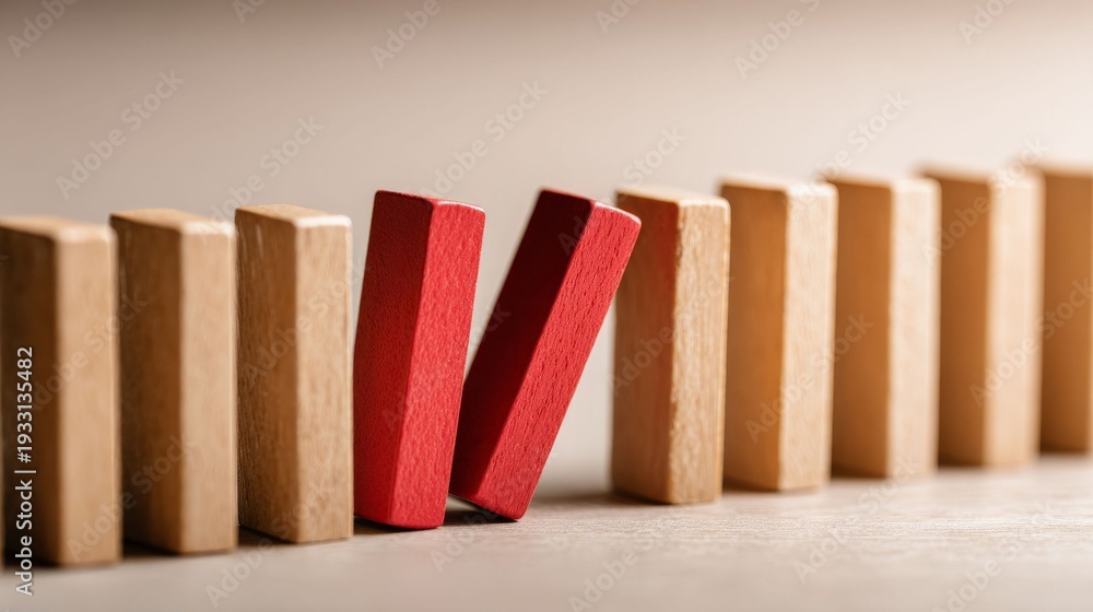 Domino Effect: Two red dominoes stand out from a line of wooden dominoes, embodying the concept of risk and the potential for a chain reaction in a clear, focused image. #1933135482