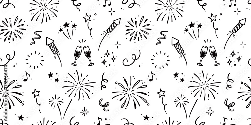 Doodle firework seamless pattern. Festive doodle background with hand drawn sparkler, confetti, and party elements for birthday or new year celebration seamless pattern. Vector illustration #1731256470