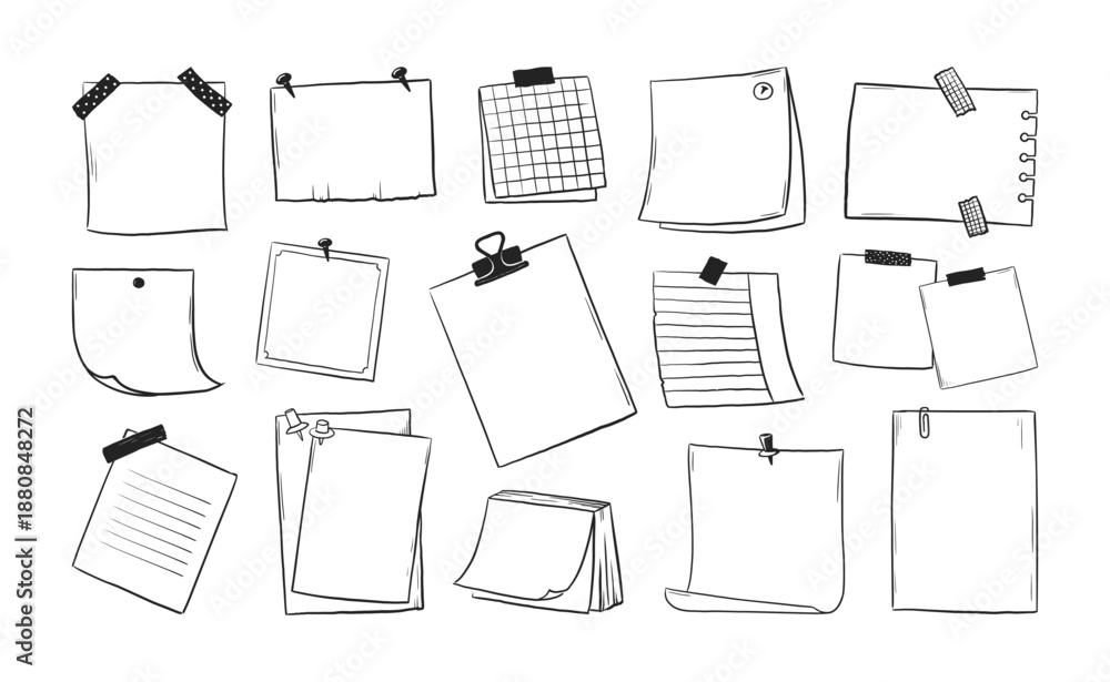 Doodle frame. Hand drawn note paper, sketch post for memo board or school sticky notice. Notepaper, sticker pad, tack and reminders or adhesive tape. Stationery set. Vector isolated icons #1880848272