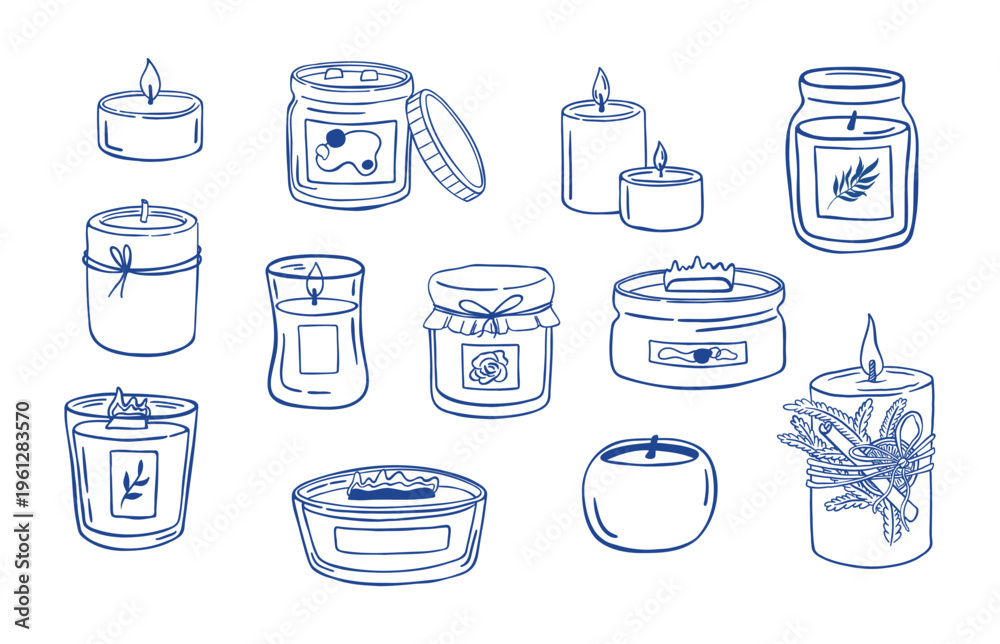 Doodle style scented candle collection with various jars and holders. Hand drawn vector illustration #1961283570
