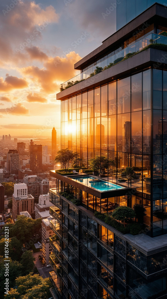 Dramatic aerial of luxury high-rise condo at golden hour with city skyline #1874620231