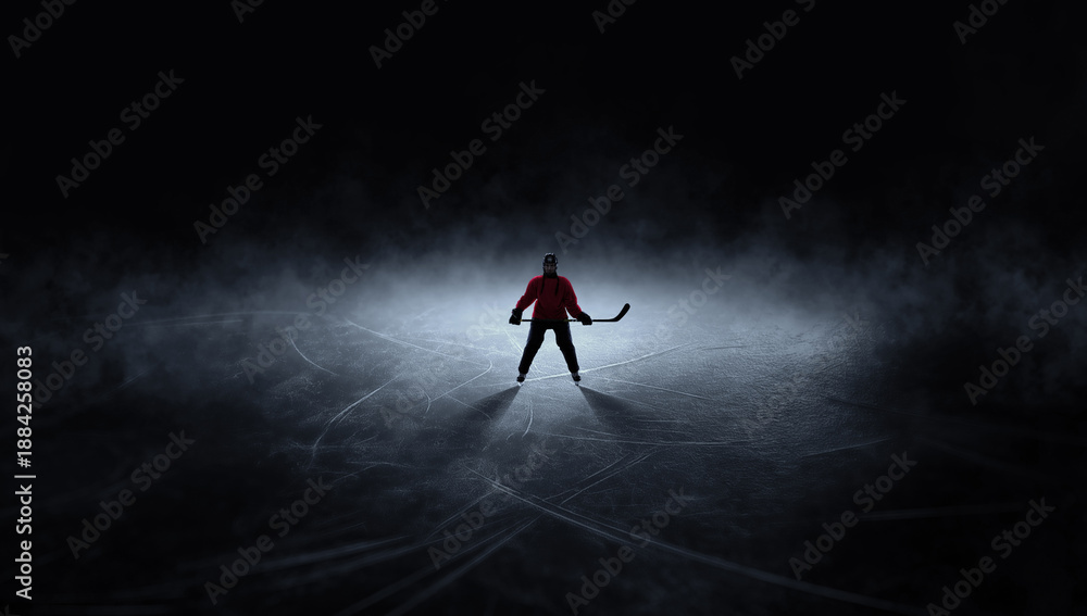 Dramatic artwork ice hockey player standing alone on dark rink. Concept of mental focus before game, professional sport pressure, readiness for competition, dramatic ice background. #1884258083