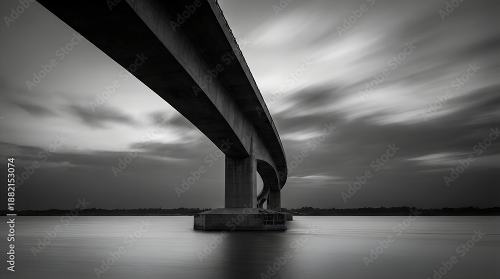 Dramatic Black and White Long Exposure of a Concrete Bridge Over a Calm River with Motion Blur Clouds Minimalist Fine Art Photography for Architectural Design Corporate Header and Background #1882153074