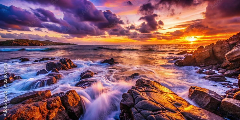 Dramatic Coastal Landscape with Squid Ink Sky and Rocky Shore #1258071214