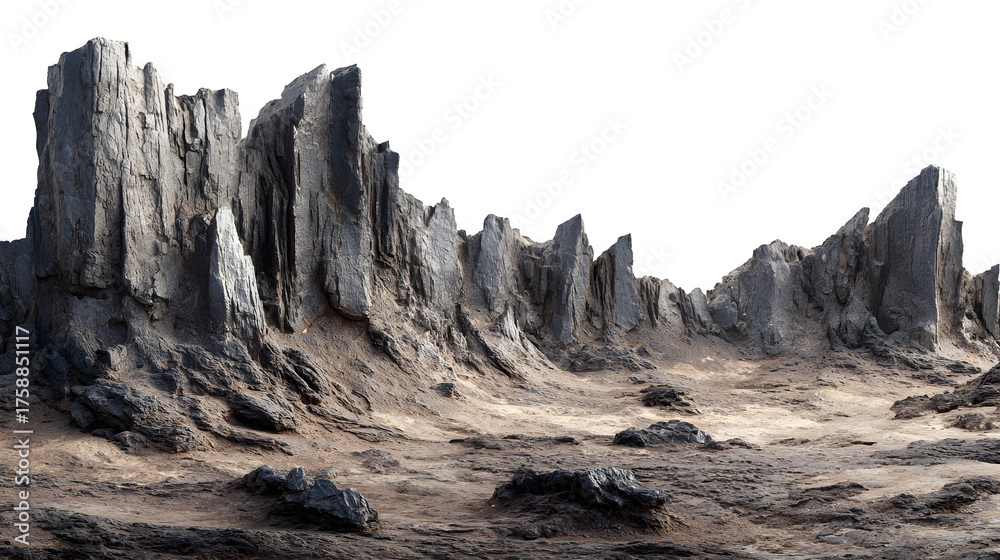 Dramatic jagged rock formations and barren terrain create a stark, alien landscape perfect for sci-fi, fantasy, or nature projects. #1758851117