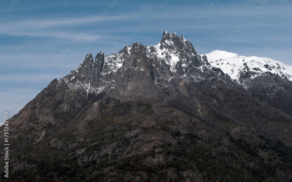 Dramatic Rocky Peaks with Scattered Snow and a Forested Mountain Base #1757247709