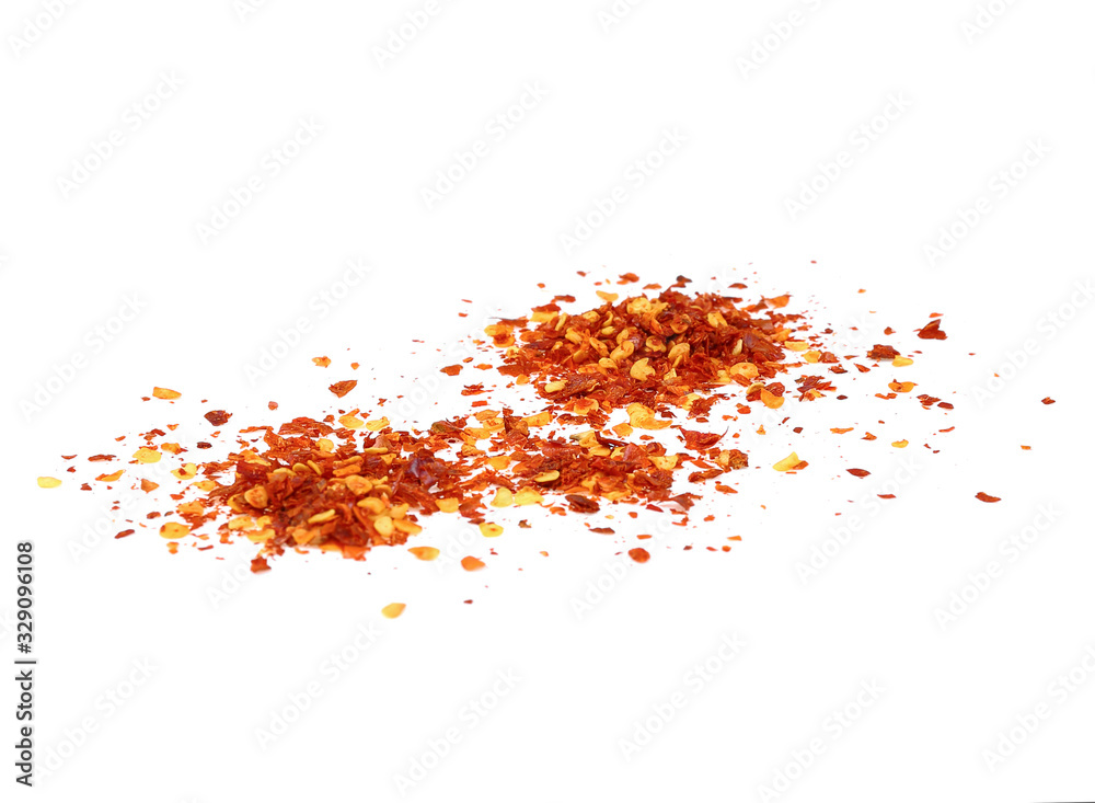 dried chili flakes and seeds isolated on white background, top view #329096108