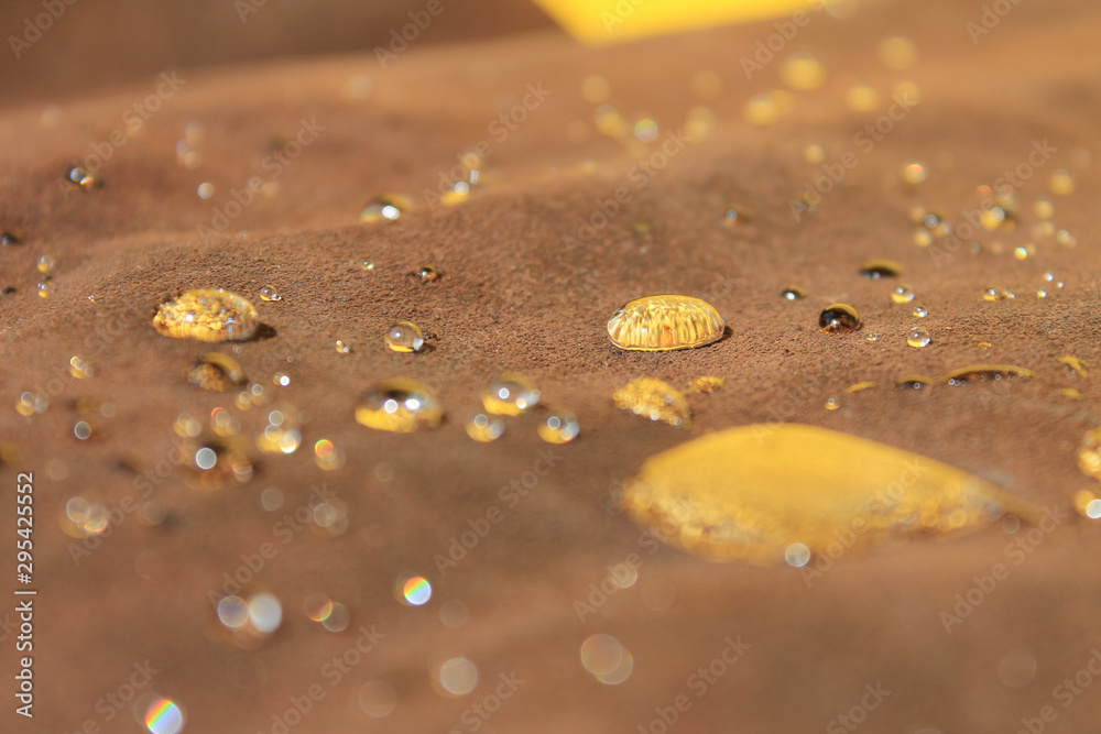 drops of water on the brown suede reflecting the yellow wall #295425552