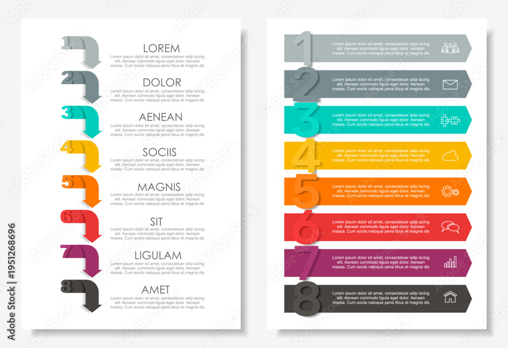 Dual infographic layouts with numbered steps, icons, and placeholder text for business, planning, or presentation purposes. Vector illustration. #1951268696