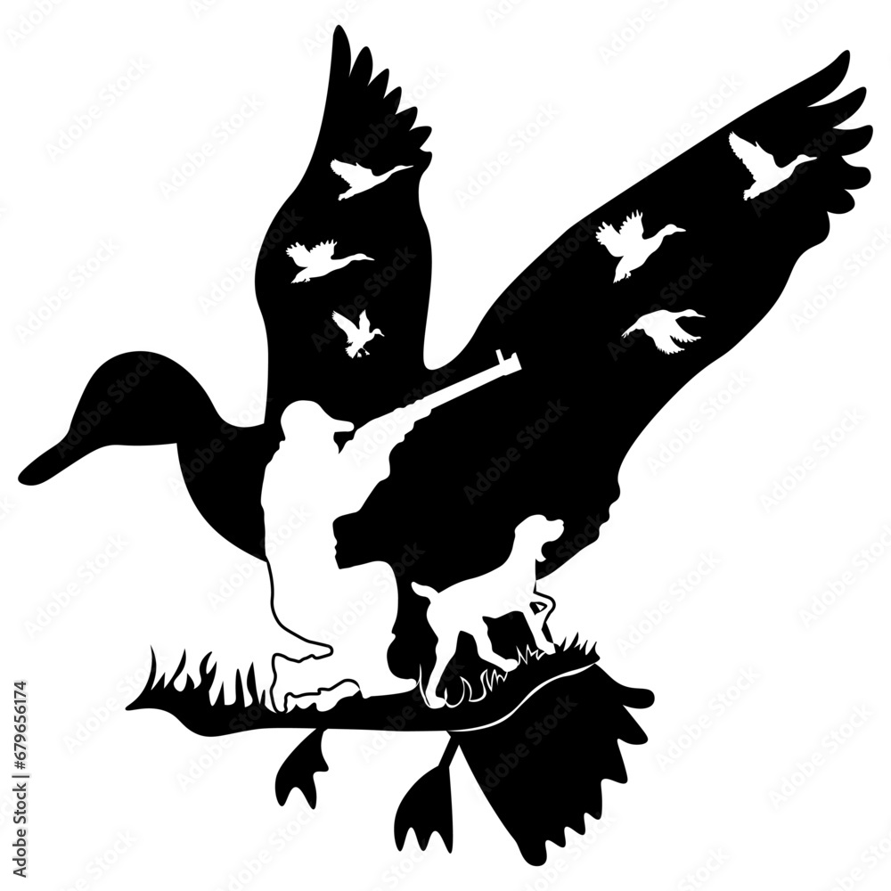 Duck and Hunter, Hand Drawn Vector Illustration #679656174