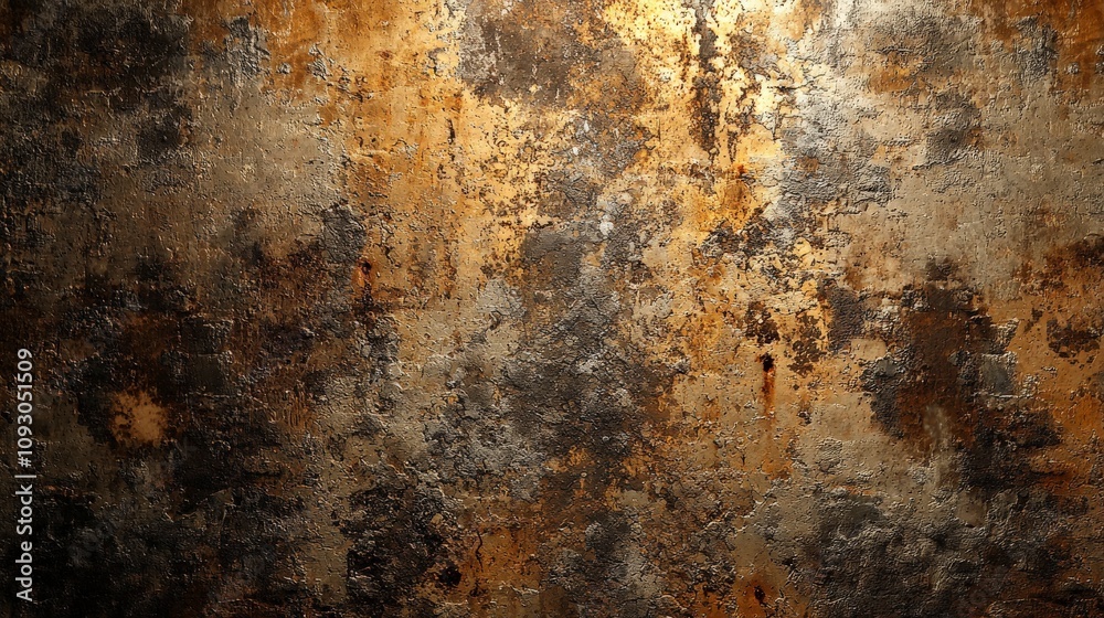 Earthy-toned, corroded metal surface featuring extensive rust and burn marks, evoking a sense of ruggedness and industrial decay, adding texture and depth. #1093051509