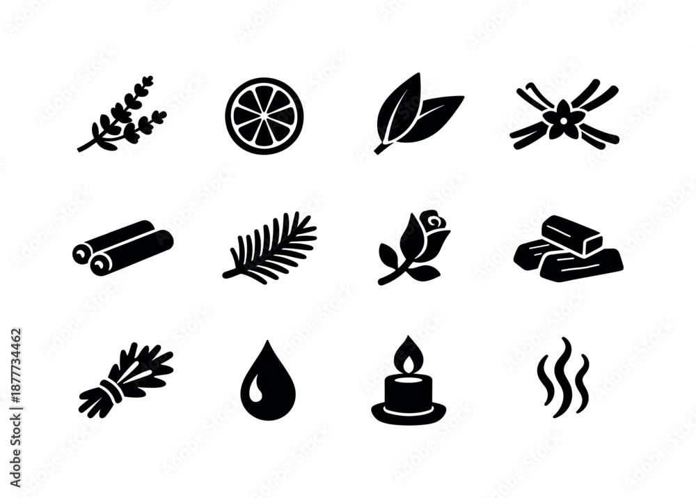 Eco Candle Icons. Eco-friendly candle scents. Solid icon set of eco-friendly candle scents: lavender sprig, citrus slice, eucalyptus leaf, vanilla pod, #1877734462