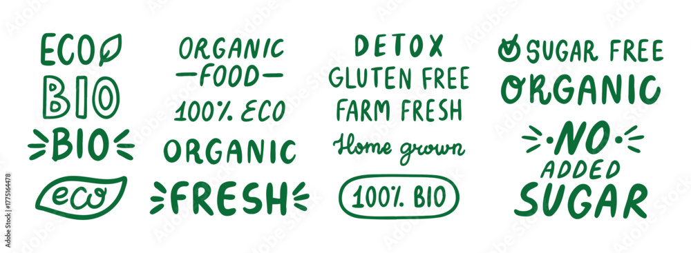 eco organic doodle hand drawn inscriptions lettering labels set. lettering text organic, 100 natural, bio, no added sugar and detox. healthy food icon #1775164478