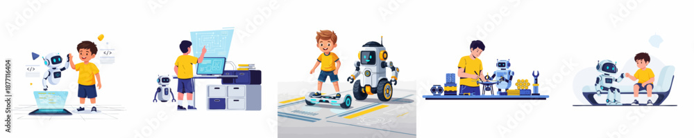 Educational technology concept showing kids coding, building, and interacting with friendly robots and AI companions. #1877116404