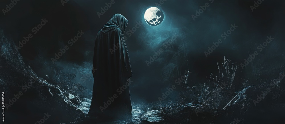 Eerie hooded figure resembling a demon in a dark surreal environment illuminated by a moonlit skull evoking a sense of fear and fantasy #978175654