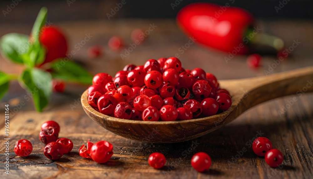 Ein Holzlöffel gefüllt roten Pfefferkörnern #1765781164