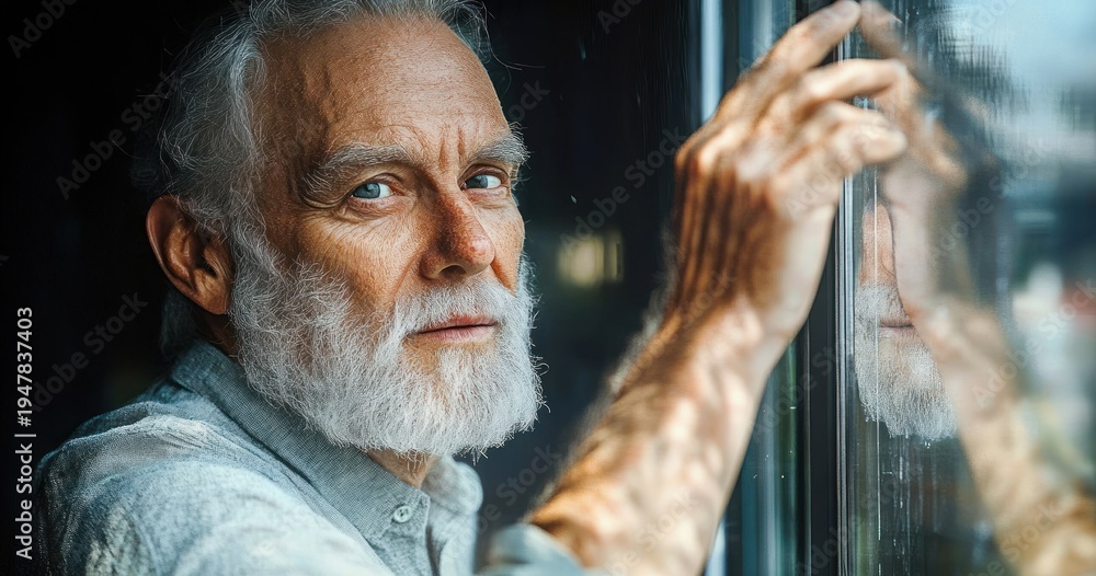 elderly man with gray hair and beard wearing a light button shirt rests a hand on a window, his reflection in the glass conveying quiet contemplation and gentle melancholy #1947837403