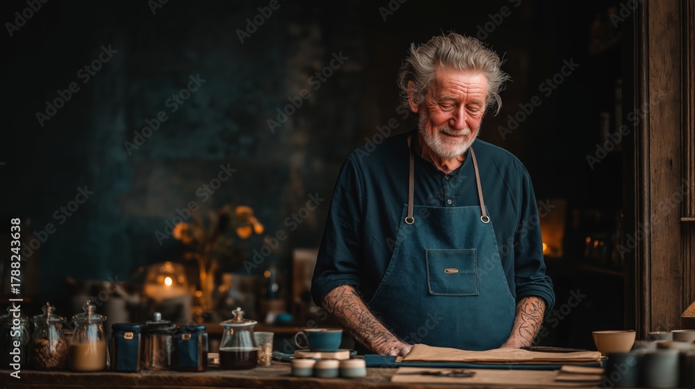 Elderly man with gray hair and beard wearing apron working at cozy cafe counter, representing active role in ageing economy workforce #1788243638