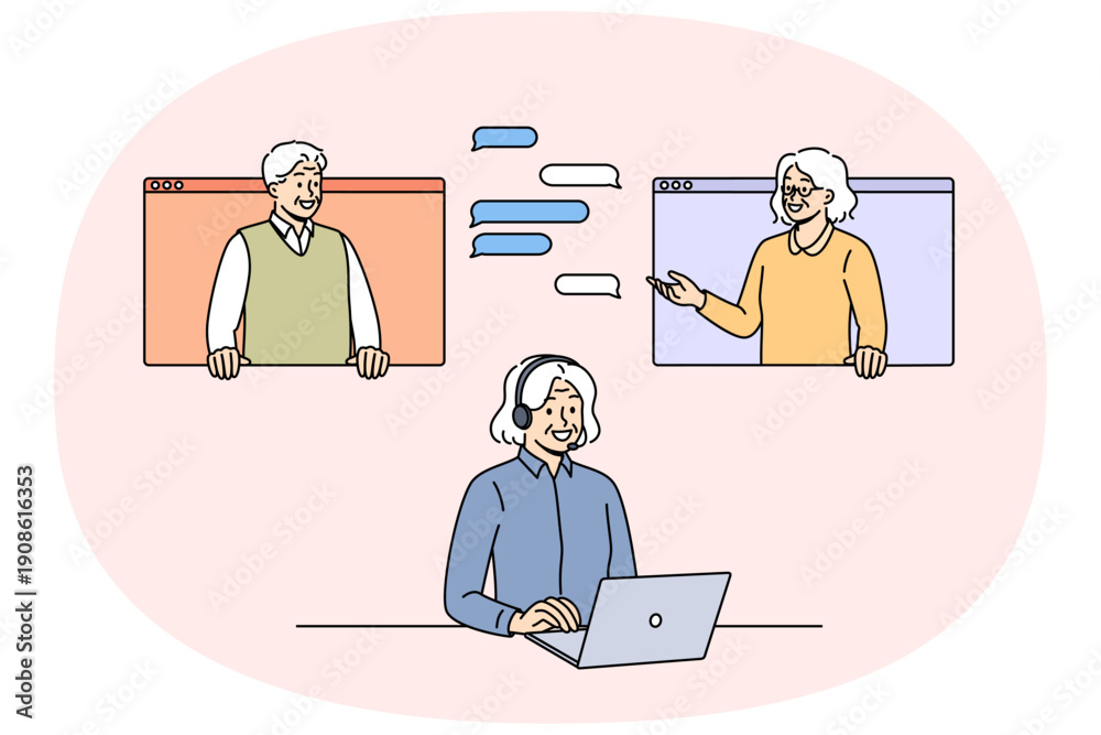 Elderly people participate in online negotiations through virtual chat, using laptop or looking out computer windows. Woman online support specialist responds to customers via text and audio messages #1908616353