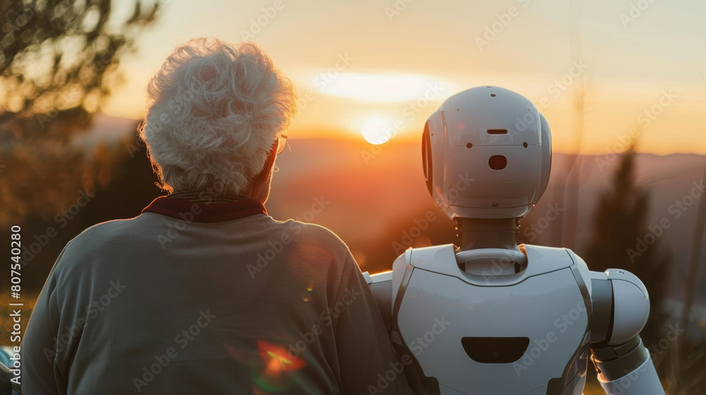 Elderly person and AI companion robot watching sunset together, focus on their shoulders and the back of their heads, showing companionship and support, emotional #807540280