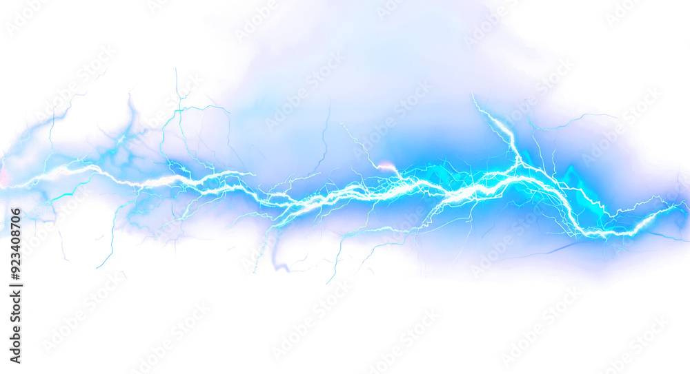 Electric blue lightning bolt streaks across a dark sky. #923408706