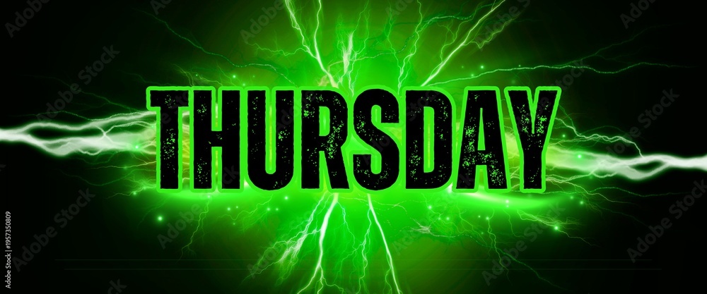 Electric Thursday: Bold text for the day of the week, with an electric green background with abstract lightning bolts symbolizing energy and dynamism, suitable for social media post. #1957350809