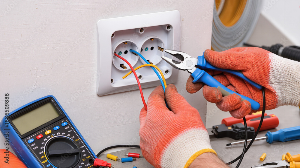 electrician installing electrical outlet, Expert performs maintenance work, Specialist handles electrical parts, Work area stays organized, Using hand tools, Gloves protect hands, Safety is first #1886509888