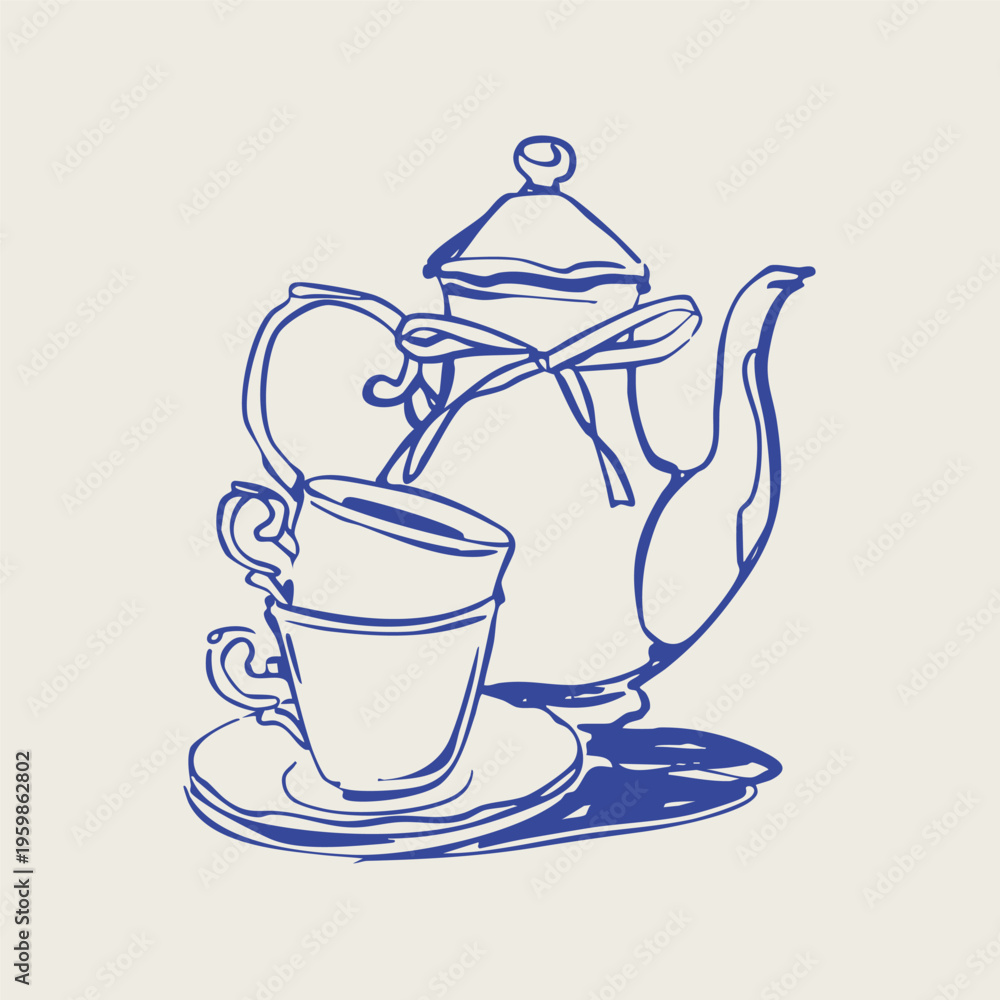 Elegant ceramic porcelain Teapot with ribbon, little tea cups, plate. Line art. Decorative outline style. Hand drawn trendy Vector Illustration. Isolated design element. Poster, print, logo template #1959862802