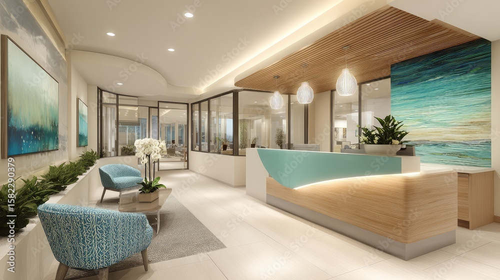 Elegant clinic entrance area with modern lighting and reception counter #1582290379