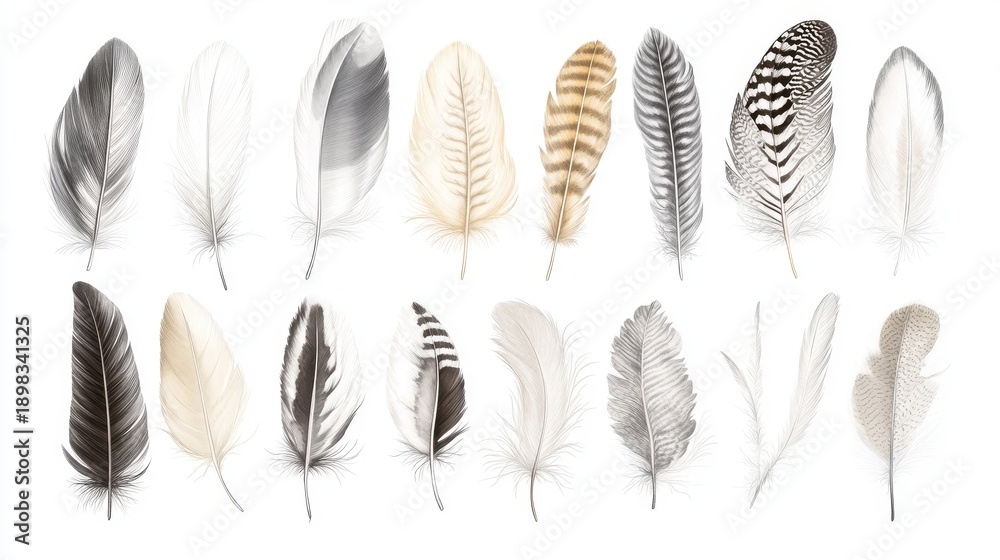 Elegant compilation of various bird feather types rendered with botanical illustration precision, featuring distinctive contour feathers, flight feathers and decorative plumes from diverse avian #1898341325