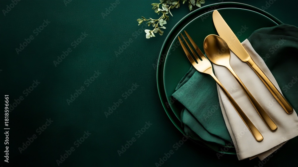 Elegant dark green table setting with luxurious gold cutlery and subtle foliage accents creates a sophisticated dining atmosphere for special occasions #1818596661