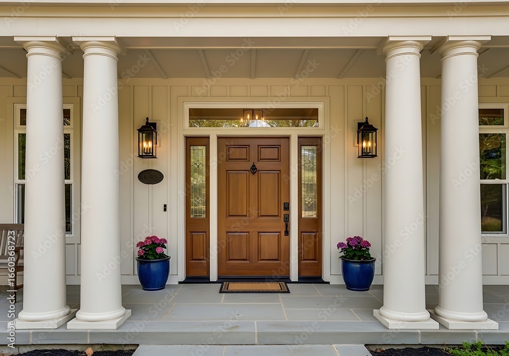 Elegant front entrance of a modern home featuring white pillars, a warm wooden door with decorative glass sidelights, and inviting outdoor lighting. #1660368723