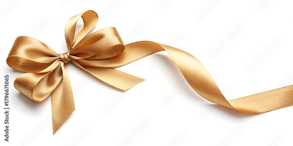 Elegant golden satin ribbon bow with flowing tail isolated on a clean white background for festive occasions and gift wrapping #1796671065