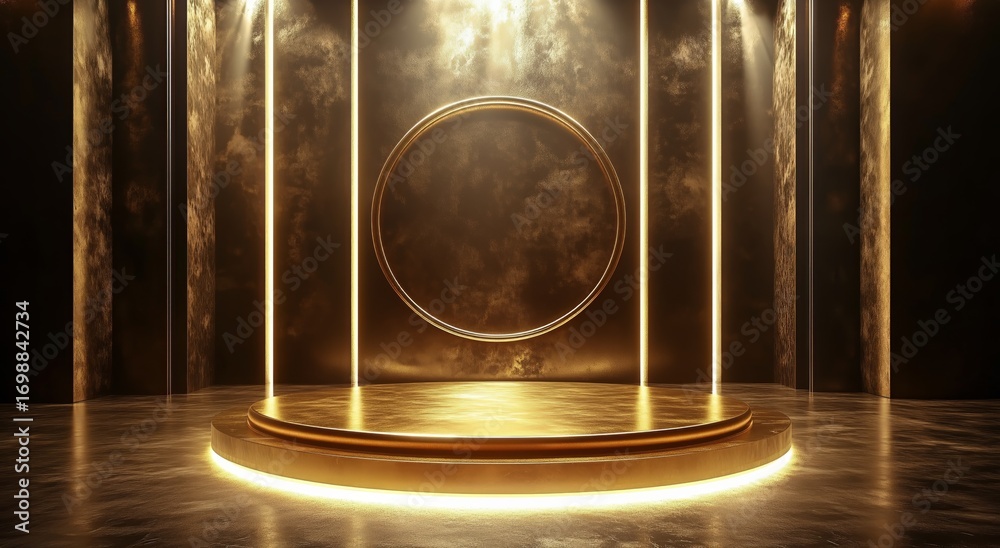Elegant Golden Stage With a Round Platform for Product Presentation or Ceremony #1698842734