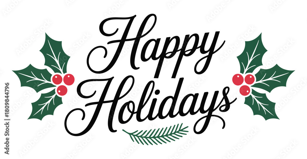 Elegant Happy Holidays greeting with holly leaves, red berries, and pine needles – festive seasonal message for winter celebrations #1809844796