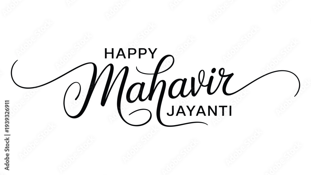 Elegant Happy Mahavir Jayanti Calligraphy Typography Design With Decorative Flourish Swashes, Jain Festival Greeting Text Illustration In Minimal Black Script Style For Religious Celebration Banner #1939326911