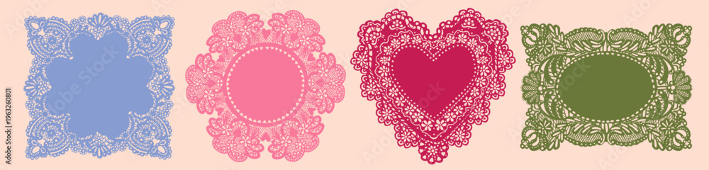Elegant lace Napkins, Frames set. Various shapes, ornaments, crochet doily borders. Hand drawn Vector illustration. Wedding invitation, greeting card, Valentine day concept. Isolated design elements #1963260801
