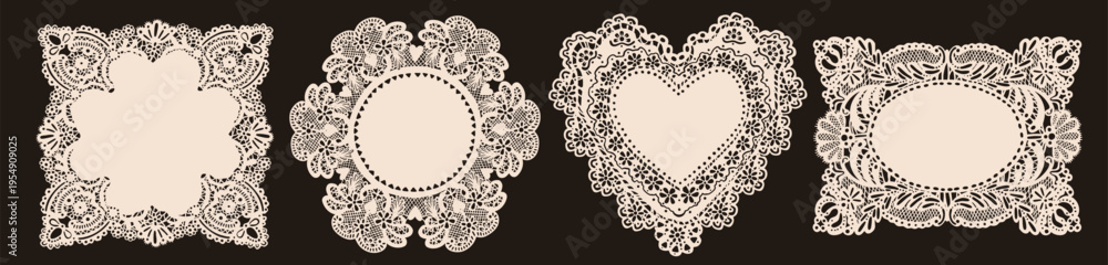 Elegant lace Napkins, Frames. Various shapes, ornaments, crochet doily borders. Hand drawn Vector illustration. Wedding invitation, greeting card, Valentine day concept. Isolated design elements #1954909025