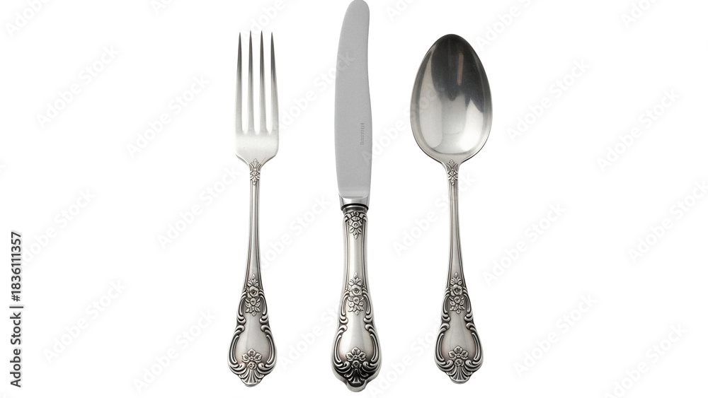 Elegant silver cutlery set isolated PNG, vintage fork knife and spoon on transparent background for restaurant and tableware design projects #1836111357