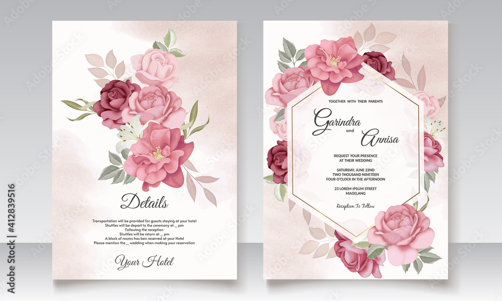 • #703642761 Elegant wedding invitation cards template with pink and blush roses design Premium Vector