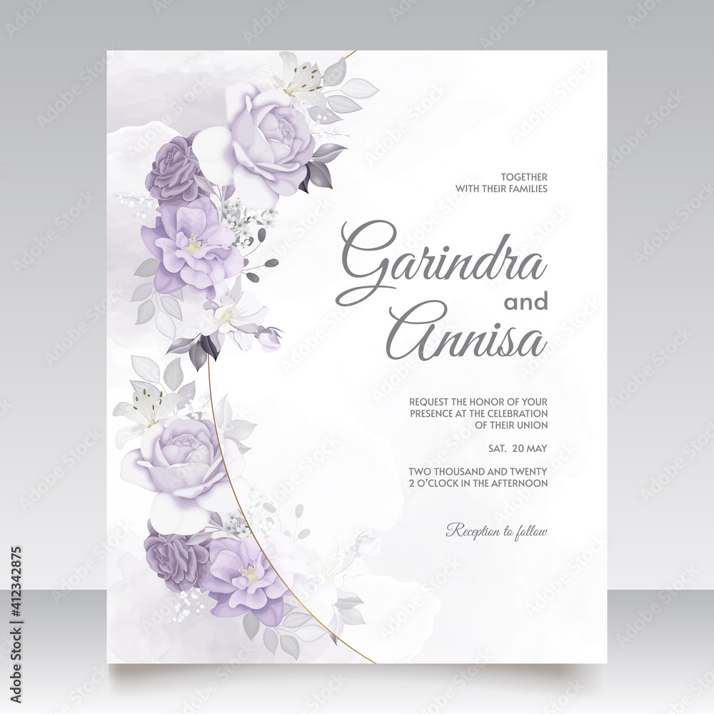Elegant wedding invitation card with purple floral and leaves template Premium Vector #412342875