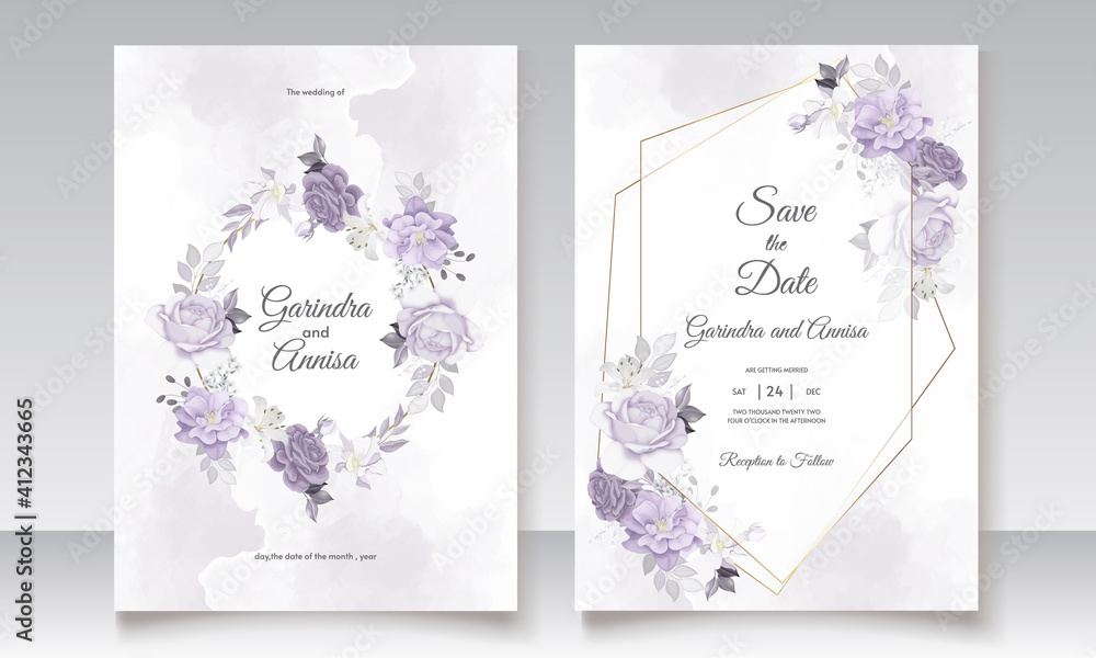 Elegant wedding invitation card with purple floral and leaves template Premium Vector #412343665