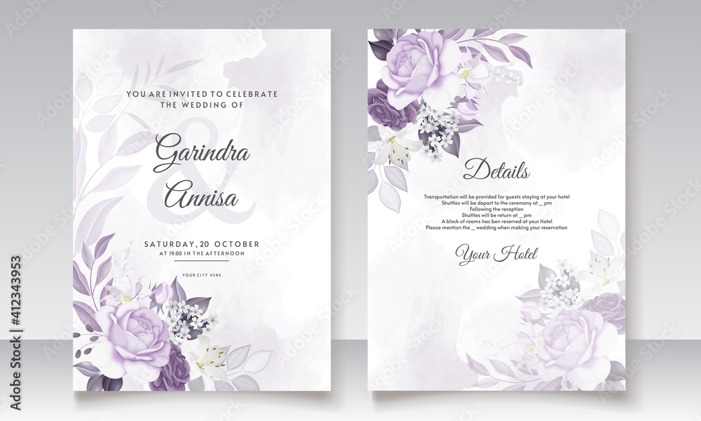 • #412343953  Elegant wedding invitation card with purple floral and leaves template Premium Vector