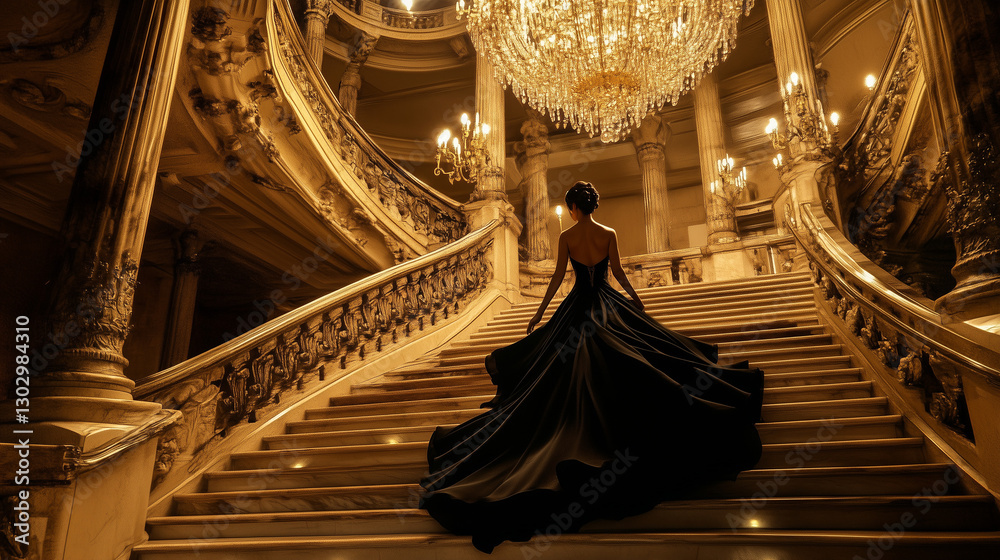 Elegant woman in gown on luxury ballroom staircase with chandelier and ornate interior #1302984310
