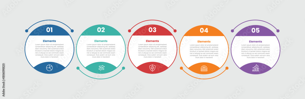 5 elements infographic comparison diagram with big circle with top and bottom badge and up and down dot line connector with 5 step for slide presentation #1806098820
