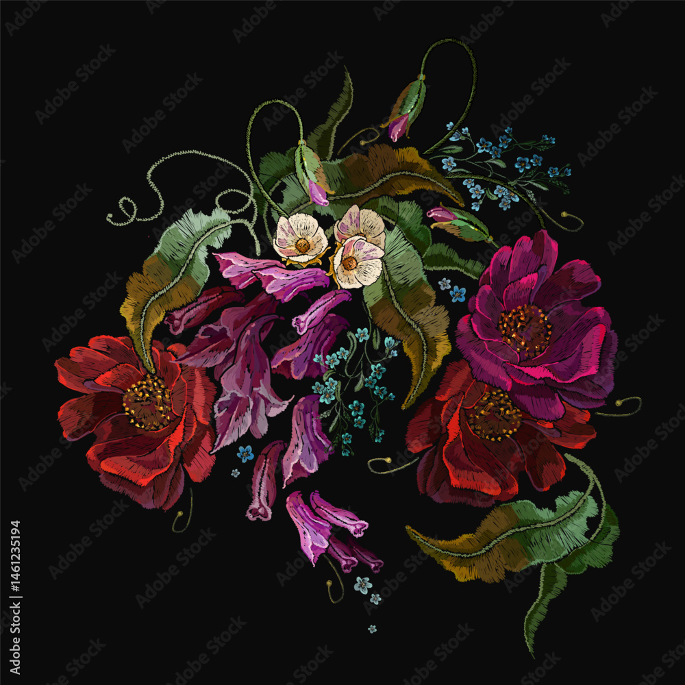 Embroidery. Bouquet of flowers. Red roses seamless pattern vector. Summer and spring garden floral art. Fashionable template for clothes #1461235194